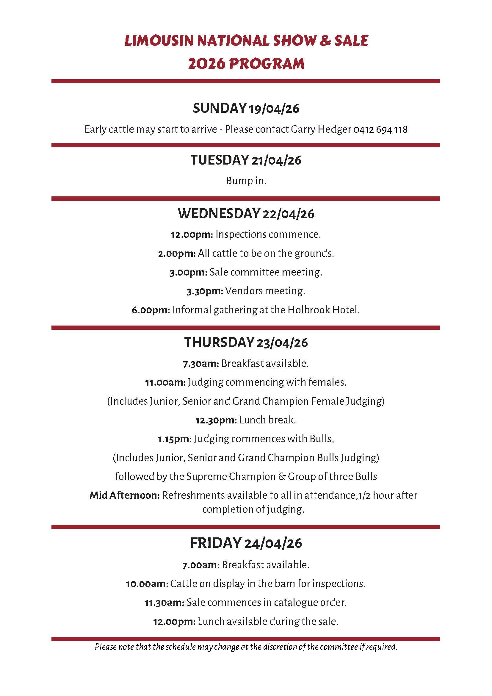 The 2026 National Show and Sale will commence Thursday April 23 and also run Friday April 24, 2026 to be held in Holbrook NSW.