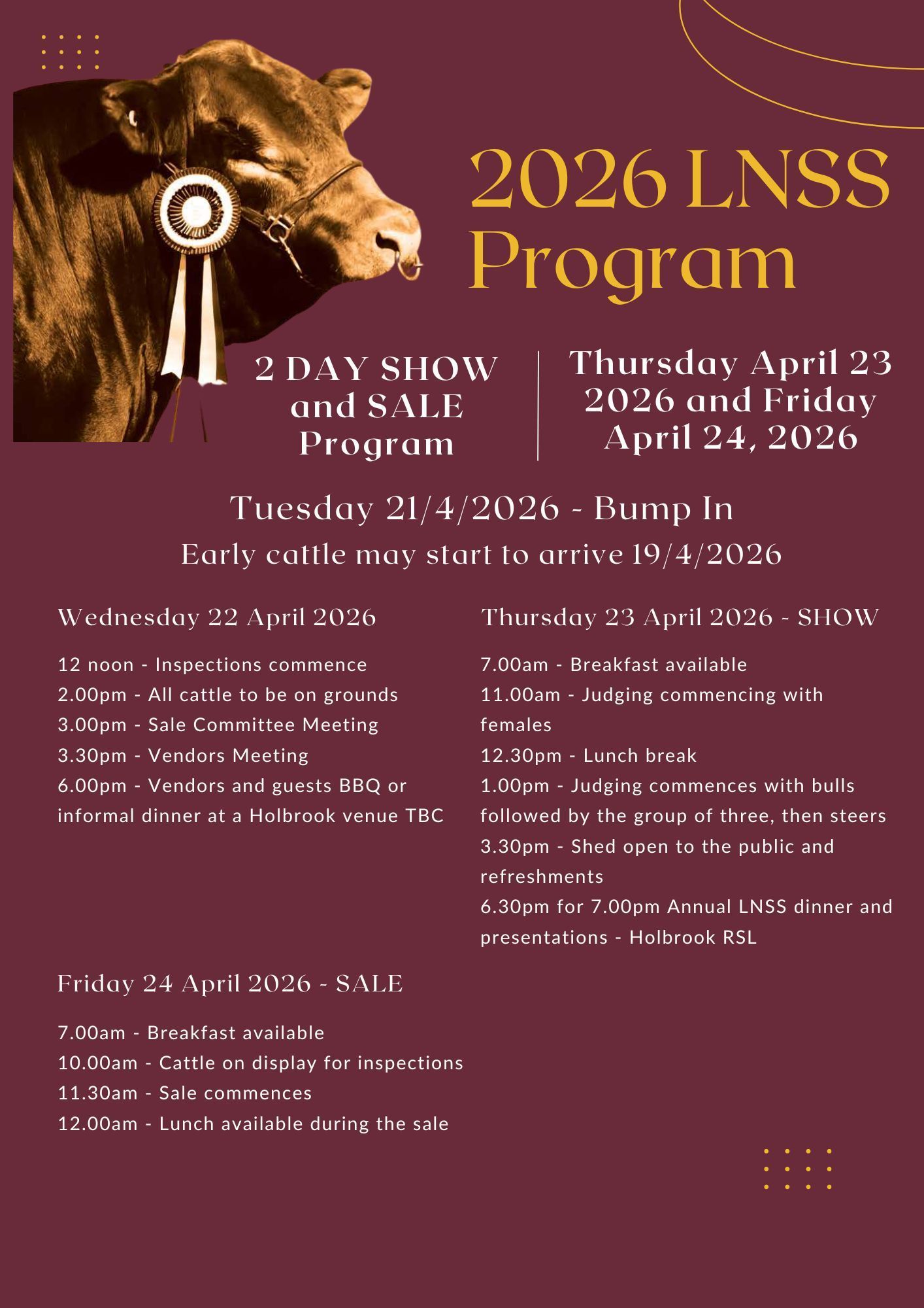 The event will run over two days with the National Show and Sale Dinner to be held at the Holbrook RSL from 6.30pm for 7.00pm on April 23, 2026.